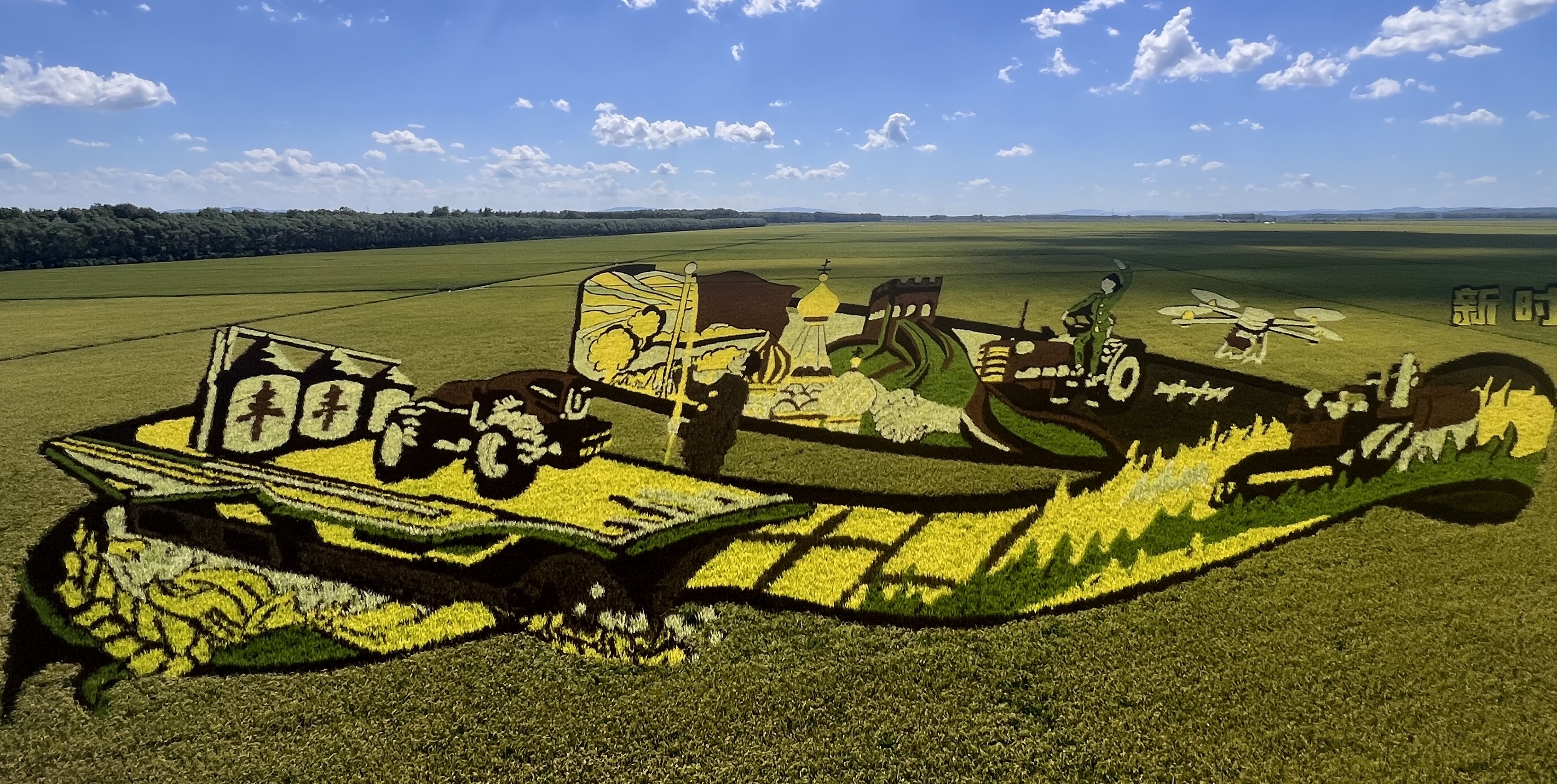 初秋时节,友谊农场五分场万亩良田的稻田画迎来了最佳观赏期。以田为纸,以稻为墨,绘制出的《岁月长河》壮美画卷正徐徐展开。游客在观光台上俯视稻田画,色彩艳丽,冲击视野,展现出现代化大农业的别样风情。