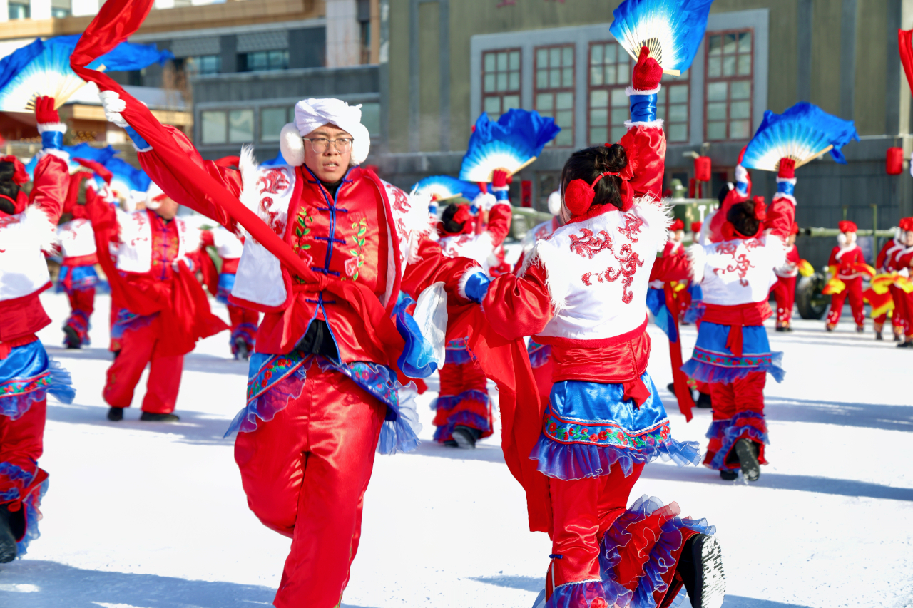 伴随着震天的锣鼓声与欢快的唢呐声,秧歌巡游队伍从知青民宿区整装出发,沿街区蜿蜒前行。百余名表演者身着五彩服饰,手持红绸、花扇翩翩起舞,热烈奔放的东北大秧歌和特色民俗表演吸引着沿途群众驻足观看。巡游队伍所到之处,欢声笑语洒满街巷,将新年的喜庆氛围延伸至小镇的每个角落,让游客深切体验东北年俗的独特韵味。