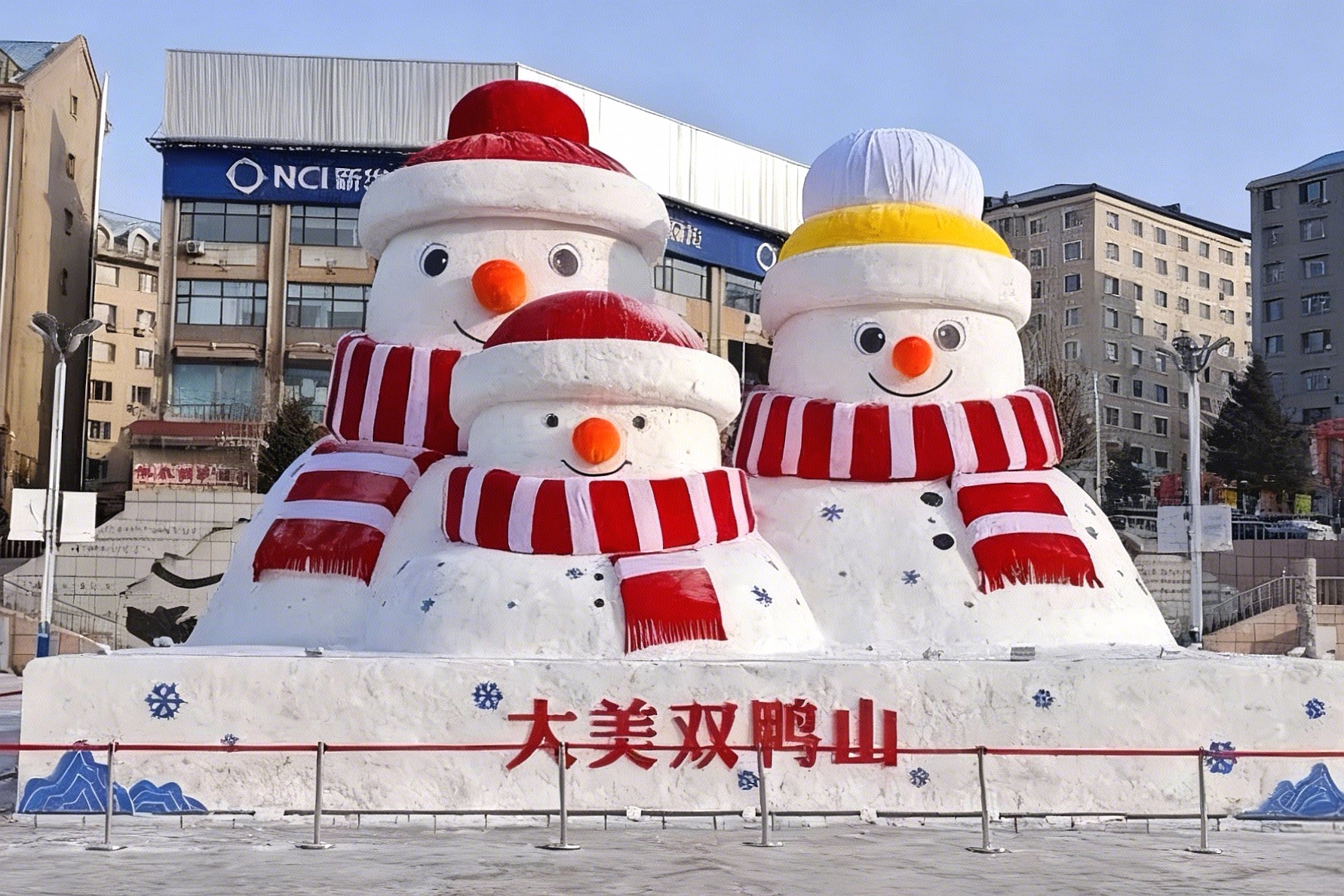 尖山区文化广电和旅游局则聚焦特色文化表达,在火车头市场规划建造9座雪雕,预计1月10日前全部完工;双兴旅游景区的5座雪雕及部分模具雪人已完工;尤为值得一提的是,市政广场上已矗立起一座高12米、宽8米、厚8米的大型雪人,其造型创意融合了尖山区专属IP“鸭鸭山”与2026马年新春元素,既保留了“鸭鸭”的萌趣灵动,又展现出骏马的昂扬姿态,打造出独属于双鸭山人的城市冰雪符号,该作品以“马到成功呀(鸭)”为美好寓意,向全市人民传递新春祝愿,彰显我市冰雪文旅的独特魅力。同时,市政广场的“冰天雪地双鸭山”景观也已基本完工。