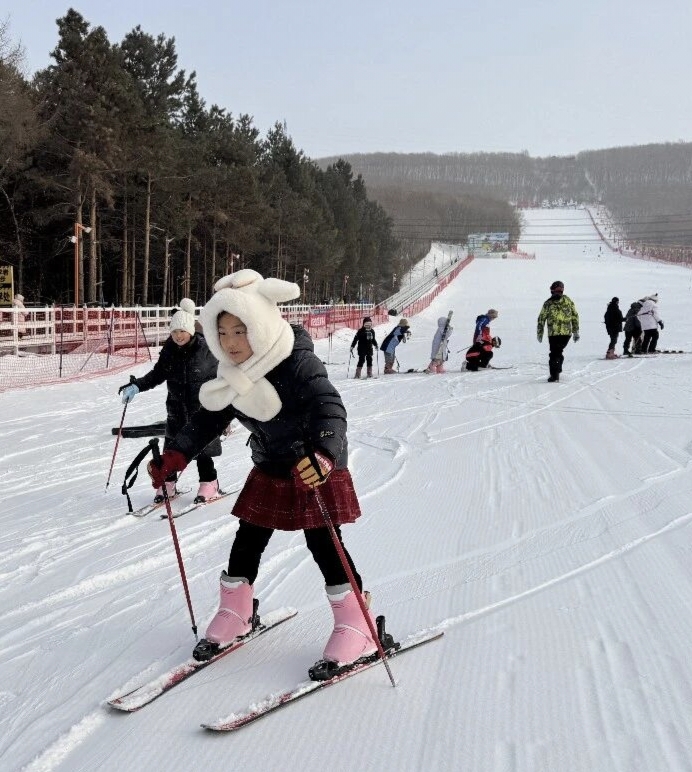 学生们分组站上滑雪场“初级道”,在教练现场指导下实践着“装备检查”“站姿平衡”“平地滑行”“转向控速”“犁式刹车”等技术要领,感受冰雪运动带来的学习乐趣。